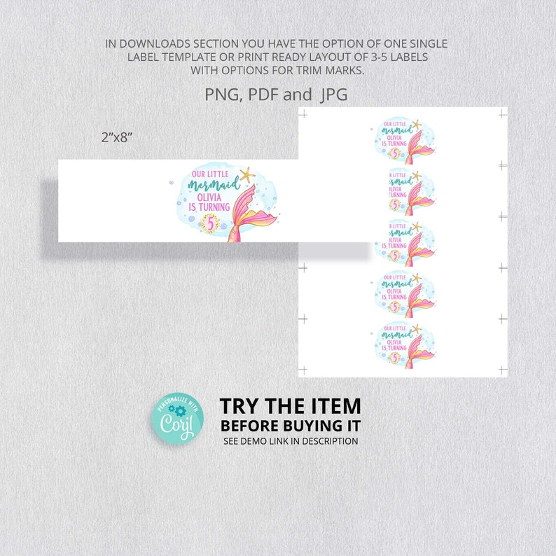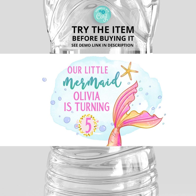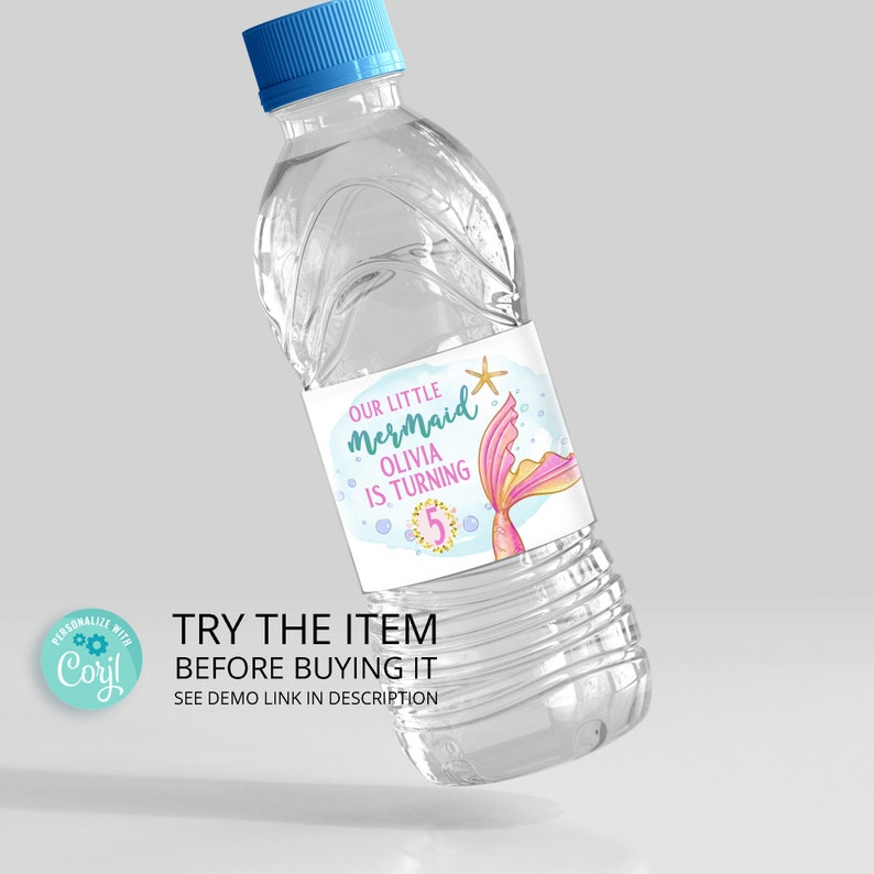 Mermaid Water Bottle Labels Mermaid Birthday Party Mermaid ... Water bottle labels are a fantastic way to remind guests of your events purpose and theme. This super simple added touch will wow your peers. Simply purchase, download after purchase, print, cut, adhere, and display. This is a digital file only.**** Watermark is removed upon download. PDF Format. 5 labels per page. Non-editable.