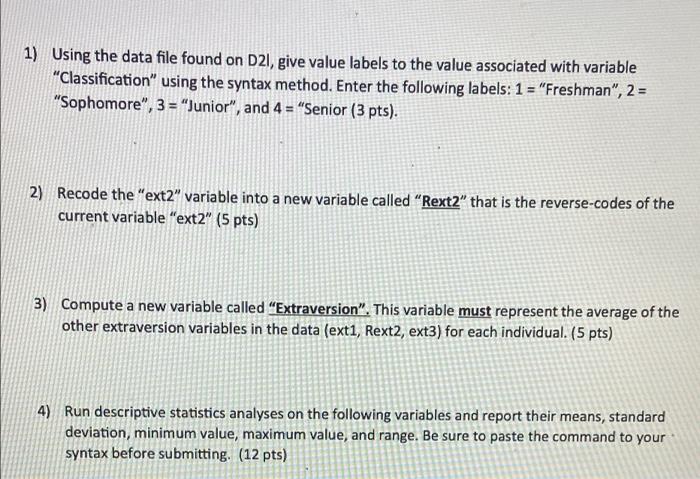 Add value labels spss syntax. Add Value Labels - Ibm ADD VALUE LABELS ADD VALUE LABELS varlist value 'label' value 'label'... [/varlist...] This command takes effect immediately. It does not read the active dataset or execute pending transformations. See the topic Command Order for more information. Example ADD VALUE LABELS JOBGRADE 'P' 'Parttime Employee' 'C' 'Customer Support'. Examples (ADD VALUE LABELS command) - IBM Specifying a Label on Multiple Lines ADD VALUE LABELS OFFICE88 1 "EMPLOYEE'S OFFICE ASSIGNMENT PRIOR" + " TO 1988". The label for the value 1 for OFFICE88is specified on two command lines. sign concatenates the two string segments, and a blank is included at the beginning of the second string in order to maintain correct spacing in the label. Value Labels - SPSS - YouTube Using both the menu driven approach as well as syntax, I demonstrate how to create value labels for variables in SPSS. Variable and Value Labels - SAGE Publications Inc Adding value labels Controlling whether labels are displayed in tables Applying the data dictionary from a previous data set Rules about Variable Names in SPSS Before SPSS 12.0, names of SPSS variables were limited to 8 characters. Even though Version 12.0 allows variable names of up to 64 characters, ... Variables and Variable Formats