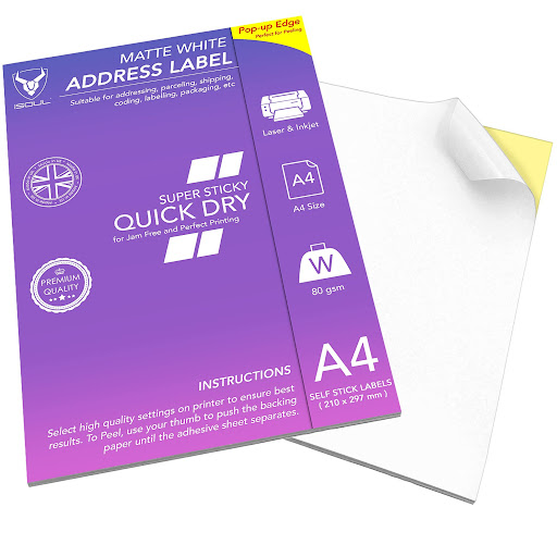 50 Sheets of Quality A4 Printer Labels White Matte Self Adhesive/Sticky Back Address Label Printing Sheet, Printable Sticker Paper [Quickdry]